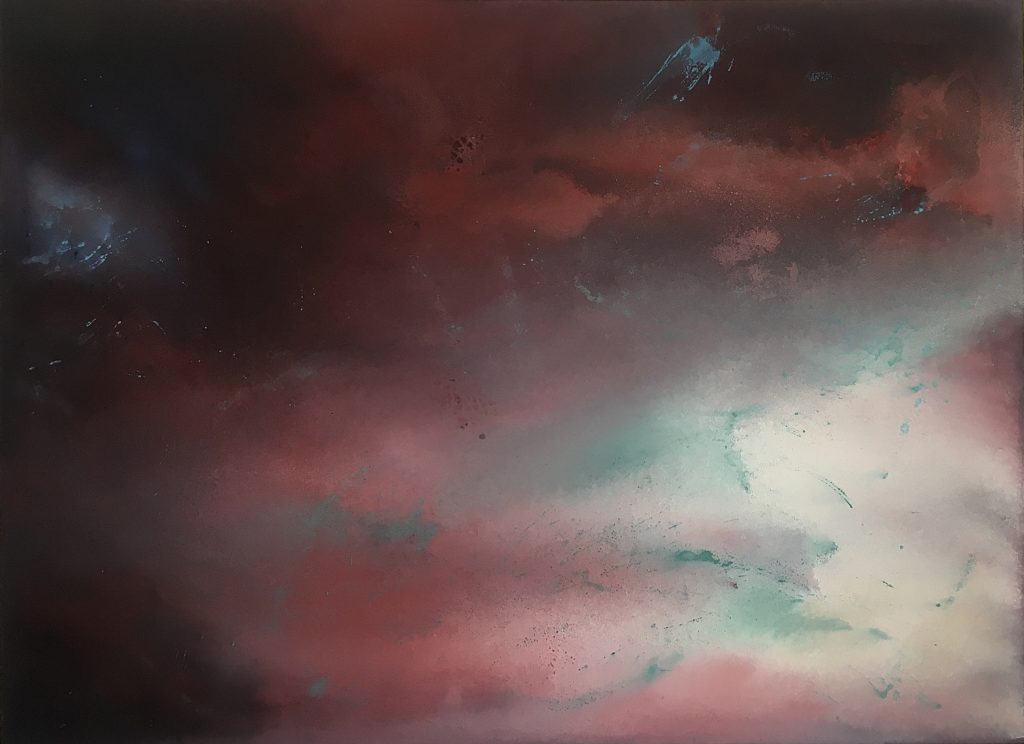 Plus j’avance et plus je sens que je souhaite transmettre avec ma peinture une expérience sensorielle et immersive; je m’intéresse ainsi de près aux qualités vibratoires et énergétiques de ma création. La forme paysagée n’est plus le centre de mon attention, d’où un glissement vers l’abstraction.