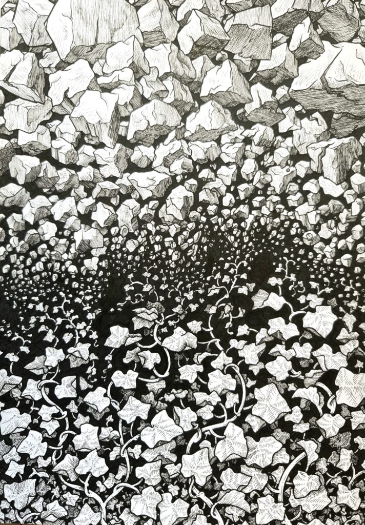 En 2018, il réalise sa première expo personnelle dans la région (au Tempo, Yverdon), puis en 2020 à Gressyland. Progressivement il se dirige vers une ligne qui vit, empreinte des pleins et des déliés, et vers des structures parfois répétées qui se retrouvent dans ses univers teintés de surréalisme et référencés d’anciens maîtres graveurs comme Maurits Cornelis Escher. Il aime que ces créations puissent contenir plusieurs étages de lecture et recherche toujours à affiner son geste et l’harmonie de sa ligne tracée.